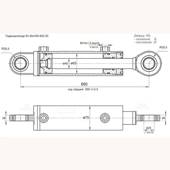 Гидроцилиндр 63.40.350.650.25 (ШС) М14х1,5 внутр. (103.000-03) прицепа - ЕДГЦ 103.000-03 (ЦГ 63.40Х350.11) 63.40х350.650.25