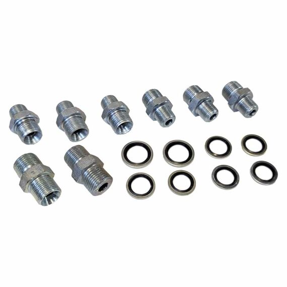 Комплект подойдет к любому гидрораспределителю 3Р40 типа GKZ с дюймовыми резьбами в отверстиях. Штуцера имеют улучшенную конструкцию - размер шестигранника увеличен (S24) для увеличения прилегания и лучшего уплотнения кольцом USIT соединения.