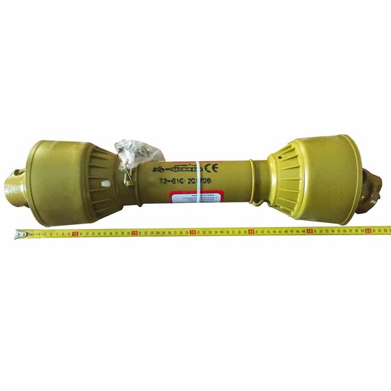 Карданный вал телескопический, раздвигается примерно на 30 % от общей длины в закрытом состоянии (по торцам вилок).