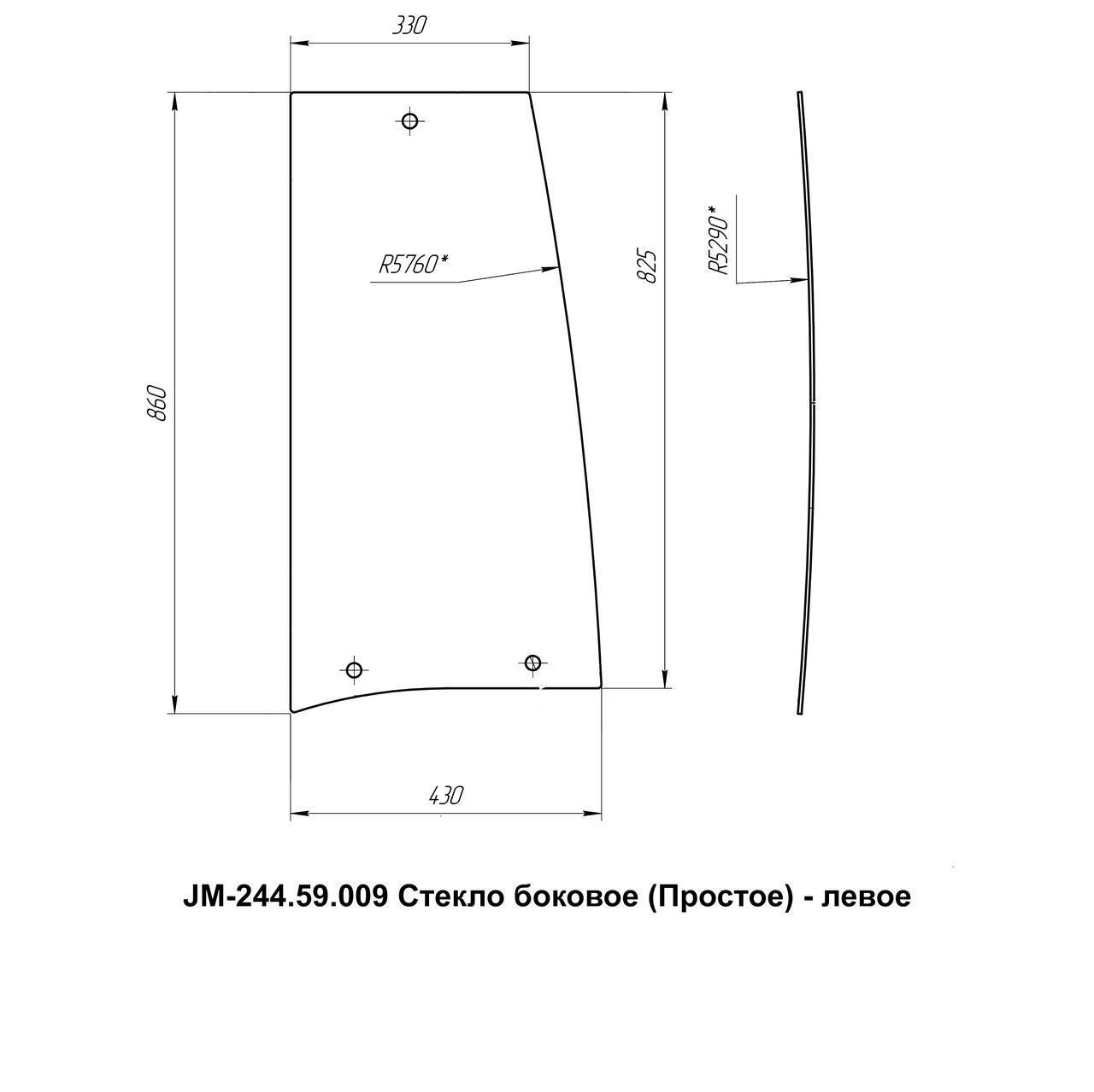 Стекло боковое левое кабинное JM-244 Kmg (Простое) - 861х430 (JM-244.59.009)